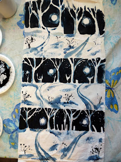 Soda soaked fabric painted with thickened dyes ready for 9 cards. Note below, the bunny I stitched on one of them. Do you have any other ideas for additional 'simple' images to be stitched on this dyed background? I think I have two left.